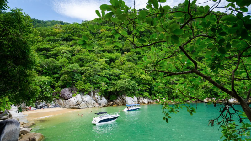 Boca de Tomatlan , once there, you can choose between a short boat ride which in less than 10 minutes will take you to Playa Colomitos or make your way through the exotic vegetation and follow the walking path that leads to this wonderful corner of the bay.